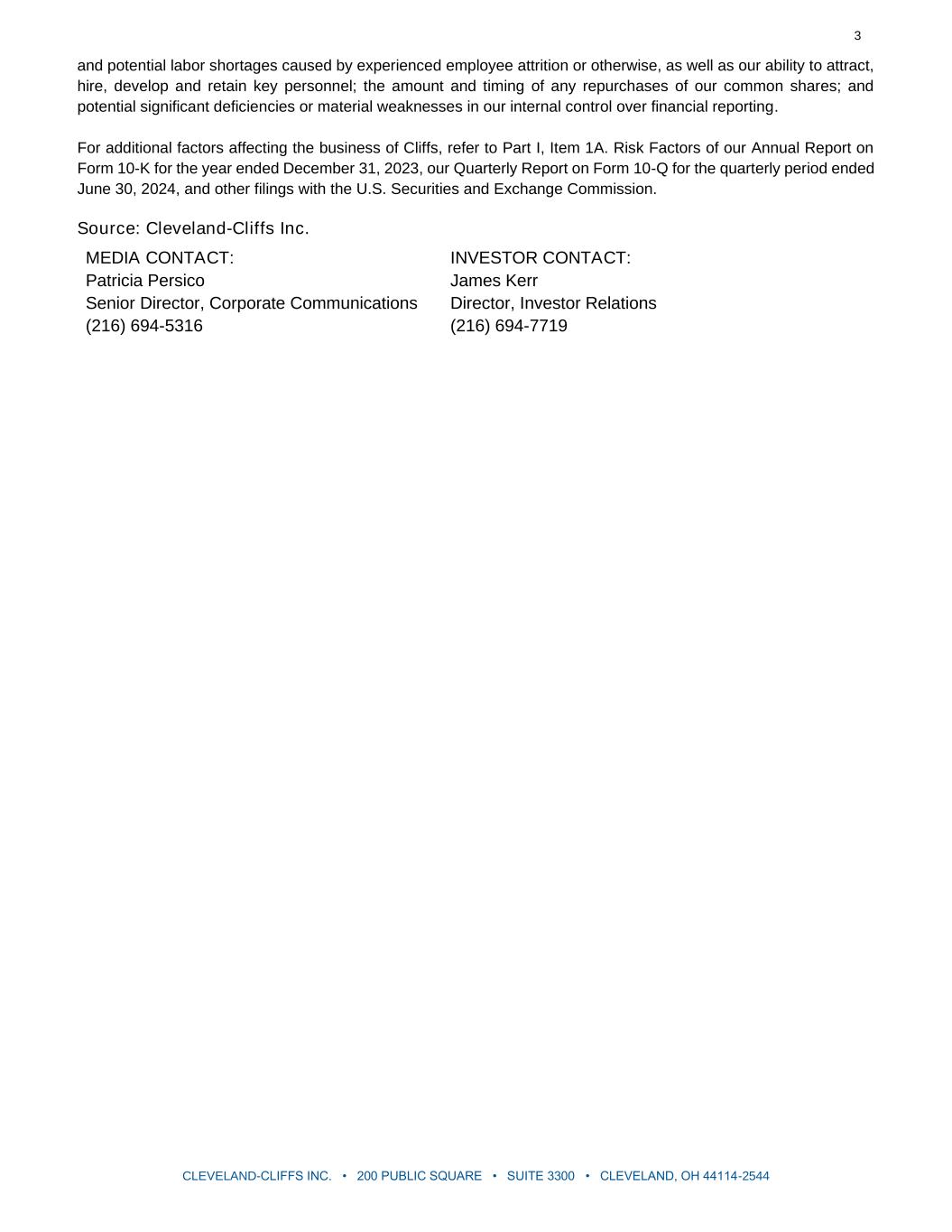 CLEVELAND-CLIFFS INC. • 200 PUBLIC SQUARE • SUITE 3300 • CLEVELAND, OH 44114-2544 3 and potential labor shortages caused by experienced employee attrition or otherwise, as well as our ability to attract, hire, develop and retain key personnel; the amount and timing of any repurchases of our common shares; and potential significant deficiencies or material weaknesses in our internal control over financial reporting. For additional factors affecting the business of Cliffs, refer to Part I, Item 1A. Risk Factors of our Annual Report on Form 10-K for the year ended December 31, 2023, our Quarterly Report on Form 10-Q for the quarterly period ended June 30, 2024, and other filings with the U.S. Securities and Exchange Commission. Source: Cleveland-Cliffs Inc. MEDIA CONTACT: Patricia Persico Senior Director, Corporate Communications (216) 694-5316 INVESTOR CONTACT: James Kerr Director, Investor Relations (216) 694-7719