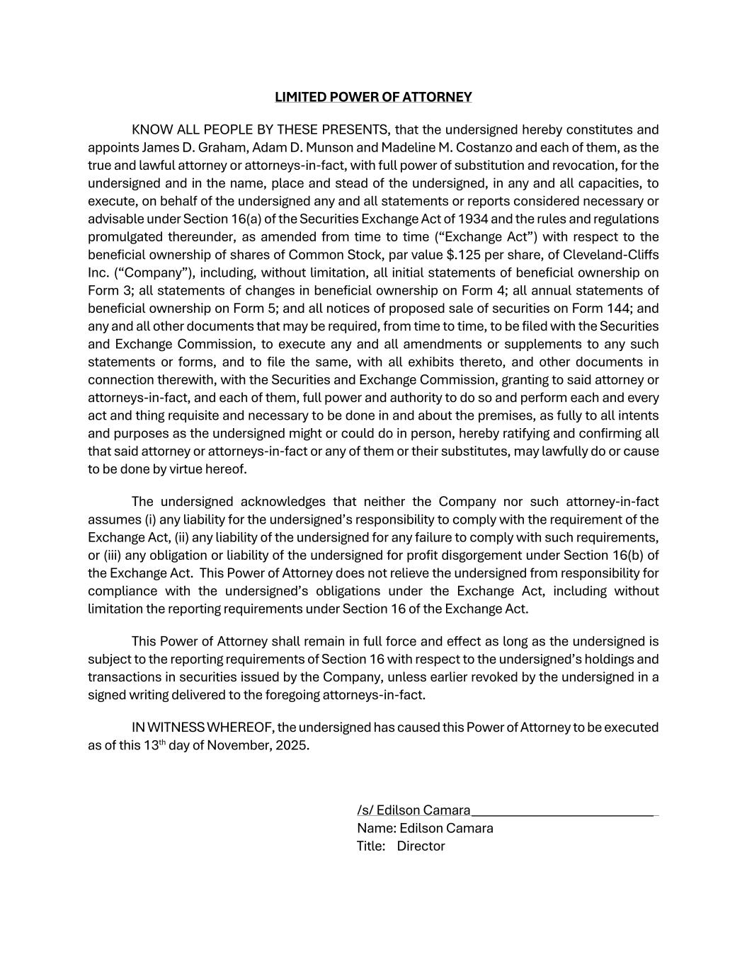 LIMITED POWER OF ATTORNEY KNOW ALL PEOPLE BY THESE PRESENTS, that the undersigned hereby constitutes and appoints James D. Graham, Adam D. Munson and Madeline M. Costanzo and each of them, as the true and lawful attorney or attorneys-in-fact, with full power of substitution and revocation, for the undersigned and in the name, place and stead of the undersigned, in any and all capacities, to execute, on behalf of the undersigned any and all statements or reports considered necessary or advisable under Section 16(a) of the Securities Exchange Act of 1934 and the rules and regulations promulgated thereunder, as amended from time to time (“Exchange Act”) with respect to the beneficial ownership of shares of Common Stock, par value $.125 per share, of Cleveland-Cliffs Inc. (“Company”), including, without limitation, all initial statements of beneficial ownership on Form 3; all statements of changes in beneficial ownership on Form 4; all annual statements of beneficial ownership on Form 5; and all notices of proposed sale of securities on Form 144; and any and all other documents that may be required, from time to time, to be filed with the Securities and Exchange Commission, to execute any and all amendments or supplements to any such statements or forms, and to file the same, with all exhibits thereto, and other documents in connection therewith, with the Securities and Exchange Commission, granting to said attorney or attorneys-in-fact, and each of them, full power and authority to do so and perform each and every act and thing requisite and necessary to be done in and about the premises, as fully to all intents and purposes as the undersigned might or could do in person, hereby ratifying and confirming all that said attorney or attorneys-in-fact or any of them or their substitutes, may lawfully do or cause to be done by virtue hereof. The undersigned acknowledges that neither the Company nor such attorney-in-fact assumes (i) any liability for the undersigned’s responsibility to comply with the requirement of the Exchange Act, (ii) any liability of the undersigned for any failure to comply with such requirements, or (iii) any obligation or liability of the undersigned for profit disgorgement under Section 16(b) of the Exchange Act. This Power of Attorney does not relieve the undersigned from responsibility for compliance with the undersigned’s obligations under the Exchange Act, including without limitation the reporting requirements under Section 16 of the Exchange Act. This Power of Attorney shall remain in full force and effect as long as the undersigned is subject to the reporting requirements of Section 16 with respect to the undersigned’s holdings and transactions in securities issued by the Company, unless earlier revoked by the undersigned in a signed writing delivered to the foregoing attorneys-in-fact. IN WITNESS WHEREOF, the undersigned has caused this Power of Attorney to be executed as of this 13th day of November, 2025. /s/ Edilson Camara ___________________________ Name: Edilson Camara Title: Director