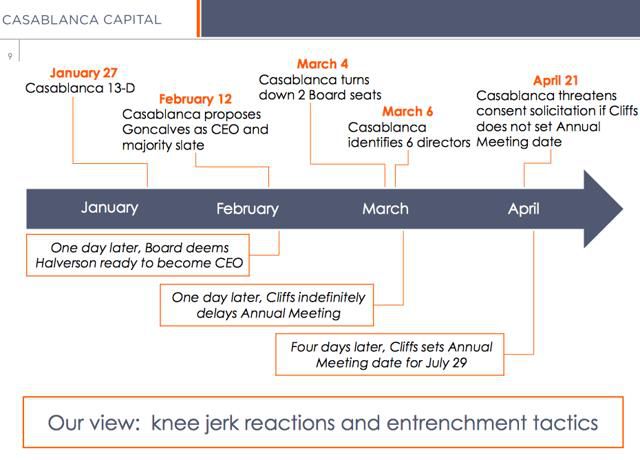 Cliffs' dubious to outright hostile treatment of Casablanca's proposals did not end there. The following month, in the days after Casablanca rejected a Cliffs proposal that it receive two board seats and no more, Casablanca nominated six alternative directors. The following day, Cliffs indefinitely delayed the company's annual meeting. The following month, Cliffs set an annual meeting date after Casablanca forced the issue. Below is a timetable that Casablanca prepared, highlighting these events. (click to enlarge)