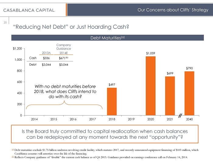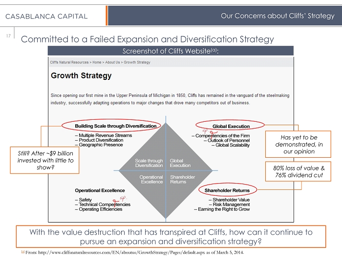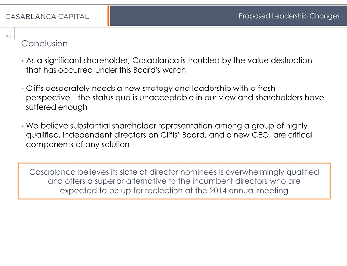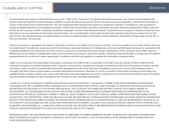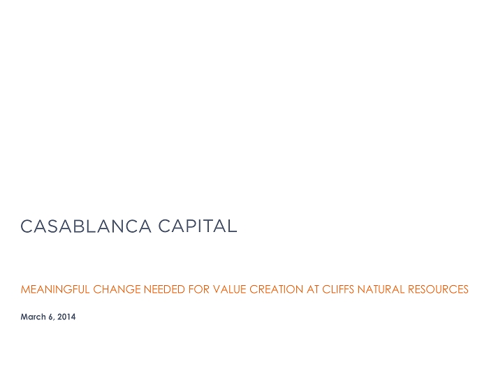 Disclaimer 1 This presentation with respect to Cliffs Natural Resources, Inc. ("Cliffs" or the "Company") is for general informational pur pos es only. It does not have regard to the specific investment objective, financial situation, suitability or particular need of any specific person who may receive thi s p resentation, and should not be taken as advice on the merits of any investment decision. The views expressed herein represent the opinions of Casablanca Capital LP ( "Ca sablanca"), and are based on publicly available information and Casablanca analyses. Certain financial information and data used herein have been derived or obtained from filings made with the SEC by the Company or other companies considered comparable, and from other third party reports. Casablanca has not sough t o r obtained consent from any third party to use any statements or information indicated herein. Any such statements or information should not be viewed as in dicating the support of such third party for the views expressed herein. No representation or warranty is made that data or information, whether derived or obta ine d from filings made with the SEC or from any third party, are accurate. There is no assurance or guarantee with respect to the prices at which any securities of the Company will trade, and such sec uri ties may not trade at prices that may be implied herein. The estimates, projections, pro forma information and potential impact of Casablanca's action plan set for th herein are based on assumptions that Casablanca believes to be reasonable, but there can be no assurance or guarantee that actual results or performance of the Co mpa ny will not differ, and such differences may be material. This presentation does not recommend the purchase or sale of any security. Casablanca reserves t he right to change any of its opinions expressed herein at any time as it deems appropriate. Casablanca disclaims any obligation to update the information contained he rein. Under no circumstances is this presentation to be used or considered as an offer to sell or a solicitation of an offer to buy an y security. Private investment funds advised by Casablanca currently hold shares of the Company's common stock. Casablanca manages investment funds that are in th e b usiness of trading – buying and selling – public securities. It is possible that there will be developments in the future that cause Casablanca and/or one o r more of the investment funds it manages, from time to time (in open market or privately negotiated transactions or otherwise), to sell all or a portion of th eir shares (including via short sales), buy additional shares or trade in options, puts, calls or other derivative instruments relating to such shares. Casablanca and su ch investment funds also reserve the right to take any actions with respect to their investments in the Company as they may deem appropriate. CASABLANCA CAPITAL LP, DONALD G. DRAPKIN AND DOUGLAS TAYLOR (COLLECTIVELY, “CASABLANCA") INTEND TO FILE WITH THE SECURITIES A ND EXCHANGE COMMISSION (THE “SEC”) A DEFINITIVE PROXY STATEMENT AND ACCOMPANYING FORM OF PROXY CARD TO BE USED IN CONNECTION WITH THE SOL ICI TATION OF PROXIES FROM STOCKHOLDERS OF CLIFFS NATURAL RESOURCES INC. (THE "COMPANY") IN CONNECTION WITH THE COMPANY'S 2014 ANNUAL MEETI NG OF STOCKHOLDERS. ALL STOCKHOLDERS OF THE COMPANY ARE ADVISED TO READ THE DEFINITIVE PROXY STATEMENT AND OTHER DOCUMENTS RELATED TO THE SOLICITATION OF PROXIES BY CASABLANCA, ROBERT P. FISHER, JR., CELSO LOURENCO GONCALVES, PATRICE E. MERRIN, JOSEPH RUTKOWSKI A ND GABRIEL STOLIAR (COLLECTIVELY, THE "PARTICIPANTS"), WHEN THEY BECOME AVAILABLE, BECAUSE THEY WILL CONTAIN IMPORTANT INFORMATION, INCLUDING AD DIT IONAL INFORMATION RELATED TO THE PARTICIPANTS. WHEN COMPLETED, THE DEFINITIVE PROXY STATEMENT AND AN ACCOMPANYING PROXY CARD WILL BE FURNISHED TO SOME OR ALL OF THE COMPANY'S STOCKHOLDERS AND ARE, ALONG WITH OTHER RELEVANT DOCUMENTS, AVAILABLE AT NO CHARGE ON THE SEC'S WEB SITE AT HTTP :// WWW.SEC.GOV. IN ADDITION, OKAPI PARTNERS LLC, CASABLANCA'S PROXY SOLICITOR, WILL PROVIDE COPIES OF THE DEFINITIVE PROXY STATEMENT AND ACCO MPA NYING PROXY CARD WITHOUT CHARGE UPON REQUEST BY CALLING (212) 297 - 0720 OR TOLL - FREE AT (877) 274 - 8654 . INFORMATION ABOUT THE PARTICIPANTS AND A DESCRIPTION OF THEIR DIRECT OR INDIRECT INTERESTS BY SECURITY HOLDINGS ARE CONTAINED IN THE PRELIMINARY PROXY STATEMENT ON SCHEDULE 14A FILED BY CASABLANCA WITH THE SEC ON MARCH 6, 2014. THIS DOCUMENT CAN BE OBTAINED FREE OF CHAR GE FROM THE SOURCES INDICATED ABOVE.