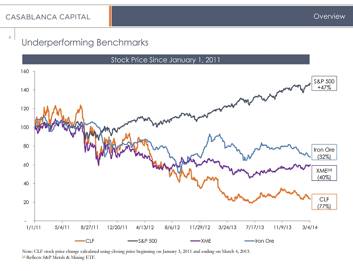 Economic Exposure of Board (a) Shares Shares Purchased Granted for Cash Executive Chairman 39,975 0 CEO 97,560 0 Other Board Members (Aggregate) 91,651 3,460 Total 229,186 3,460 Lourenco Goncalves 50,000 Casablanca 7,906,520 Overview 5 …and Demonstrated Little Faith in Cliffs, Given de Minimis Economic Interest [a ] Per Bloomberg. [b ] Reflects 1,040, 1,290 and 1,130 shares acquired by Andres Gluski on November 5, 2013, May 11, 2012 and August 1, 2011, respec ti vely. ( b )