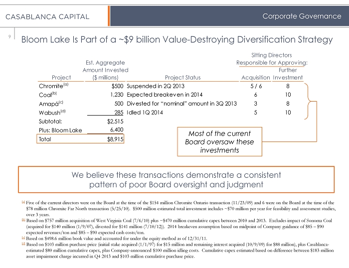 Corporate Governance 8 Majority of Existing Board Is Responsible for Failed Bloom Lake Acquisition The directors who approved the transaction, and those who permitted additional investment, should not continue to serve on the Cliffs Board Directors Cliffs Director Since Richard K. Riederer 2002 Susan M. Cunningham 2005 Barry J. Eldridge 2005 Susan M. Green 2007 Janice K. Henry 2009 James Kirsch 2010 Andrés R. Gluski 2011 Timothy W. Sullivan 2013 Mark E. Gaumond 2013 Gary B. Halverson 2013 Stephen Johnson 2013 6 of 11 current directors approved the Consolidated Thompson/ Bloom Lake transaction ($4.9 billion) [ ] of 11 approved subsequent investment in Bloom Lake (additional ~$1.5 billion) 9 of 11 approved subsequent investment in Bloom Lake (additional ~$ 1.5 billion)