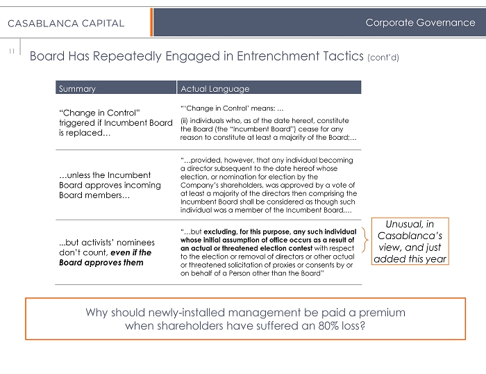 Corporate Governance 11 Board Has Repeatedly Engaged in Entrenchment Tactics (cont’d) Summary Actual Language “Change in Control” triggered if Incumbent Board is replaced… “‘Change in Control’ means: … (ii) individuals who, as of the date hereof, constitute the Board (the “Incumbent Board”) cease for any reason to constitute at least a majority of the Board;… …unless the Incumbent Board approves incoming Board members… “…provided, however, that any individual becoming a director subsequent to the date hereof whose election, or nomination for election by the Company’s shareholders, was approved by a vote of at least a majority of the directors then comprising the Incumbent Board shall be considered as though such individual was a member of the Incumbent Board,… ...but activists’ nominees don’t count, even if the Board approves them “…but excluding, for this purpose, any such individual whose initial assumption of office occurs as a result of an actual or threatened election contest with respect to the election or removal of directors or other actual or threatened solicitation of proxies or consents by or on behalf of a Person other than the Board” Unusual, in Casablanca’s view, and just added this year Why should newly - installed management be paid a premium when shareholders have suffered an 80% loss?