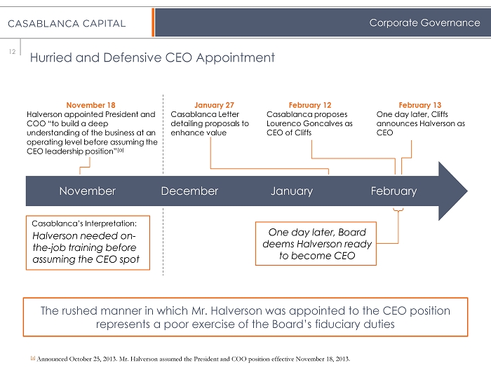 Corporate Governance 12 Hurried and Defensive CEO Appointment The rushed manner in which Mr. Halverson was appointed to the CEO position represents a poor exercise of the Board’s fiduciary duties [ a] Announced October 25, 2013. Mr. Halverson assumed the President and COO position effective November 18, 2013. One day later, Board deems Halverson ready to become CEO Casablanca’s Interpretation: Halverson needed on - the - job training before assuming the CEO spot February January December November November 18 Halverson appointed President and COO “to build a deep understanding of the business at an operating level before assuming the CEO leadership position” (a) January 27 Casablanca Letter detailing proposals to enhance value February 12 Casablanca proposes Lourenco Goncalves as CEO of Cliffs February 13 One day later, Cliffs announces Halverson as CEO