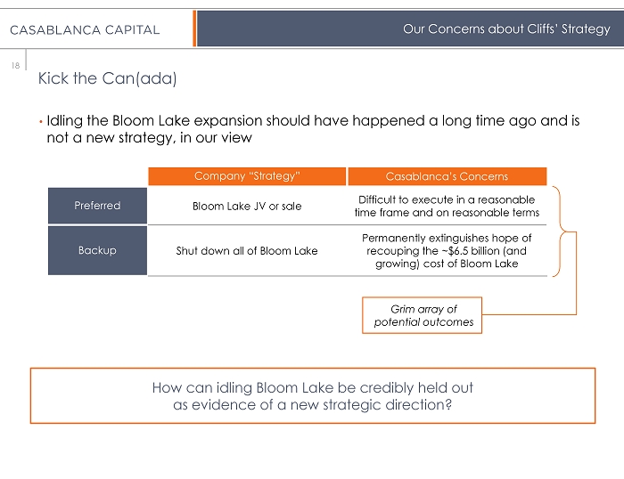 Our Concerns about Cliffs’ Strategy 18 Kick the Can(ada) • Idling the Bloom Lake expansion should have happened a long time ago and is not a new strategy, in our view Company “Strategy” Casablanca’s Concerns Preferred Bloom Lake JV or sale Difficult to execute in a reasonable time frame and on reasonable terms Backup Shut down all of Bloom Lake Permanently extinguish es hope of recouping the ~$6.5 billion (and growing) cost of Bloom Lake How can idling Bloom Lake be credibly held out as evidence of a new strategic direction? Grim array of potential outcomes