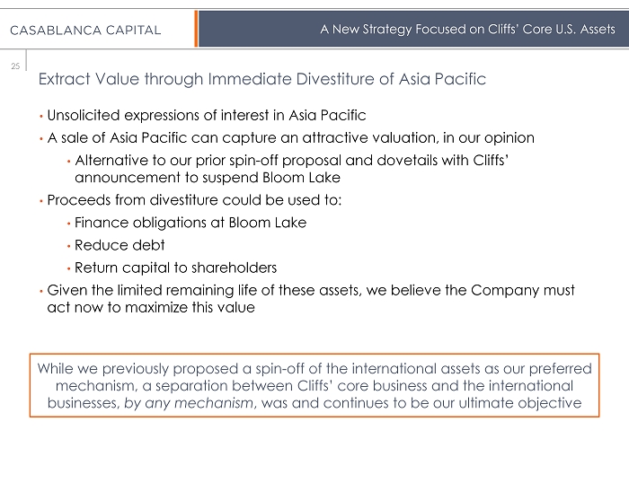 A New Strategy Focused on Cliffs’ Core U.S. Assets 24 Refocus on Core U.S. Business • We believe Cliffs ’ U.S. assets remain its greatest opportunity • Close to 60% of the iron ore production capacity in the geographically protected Great Lakes region • Largest iron ore producer in the United States • Current production rates imply 40+ years of mine life on proven reserves • Our expectations: profitable even in a commodity pricing downcycle • Cliffs should emphasize this dominant position, strategically and financially • Take steps to strengthen contractual relationships with customers • Minimize commodity price exposure Casablanca believes the Great Lakes assets are underappreciated by the market and hold the key to Cliffs’ future