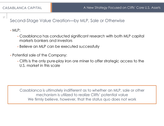 A New Strategy Focused on Cliffs’ Core U.S. Assets 27 Second - Stage Value Creation — by MLP, Sale or Otherwise • MLP: • Casablanca has conducted significant research with both MLP capital markets bankers and investors • Believe an MLP can be executed successfully • Potential sale of the Company: • Cliffs is the only pure - play iron ore miner to offer strategic access to the U.S . market in this scale Casablanca is ultimately indifferent as to whether an MLP, sale or other mechanism is utilized to realize Cliffs’ potential value We firmly believe, however, that the status quo does not work
