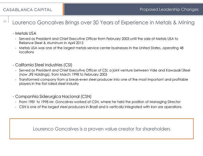 Overview 3 Casablanca Director Nominees Nominee Key Qualifications Lourenco Goncalves Hired as CEO of Metals USA in February 2003; took the company private in November 2005; IPO’d the company in April 2010 and sold the company to Reliance Steel & Aluminum in April 2013 CEO of California Steel Industries from March 1998 to February 2003 Rip Fisher Former Goldman Sachs Managing Director, Head of Mining and Head of Canadian Corporate Finance and Investment Banking Former Director of CML HealthCare Inc. Patrice Merrin Director of Stillwater Mining Former Chairman of CML HealthCare Inc. Director of Climate Change and Emissions Management Corp. Former CEO of Luscar and Executive Vice President of Sherritt International Joseph Rutkowski Former Nucor Corporation Executive Vice President of Business Development Gabriel Stoliar Managing Partner of Studio Investimentos, an asset management firm Former Vale S.A. CFO and Executive Director of Planning & Business Development Former BNDES Executive Director Douglas Taylor CEO and Co - CIO of Casablanca Capital LP Former Lazard Frères & Co and Wasserstein Perella Managing Director Former Director and CFO of Sapphire Industrials