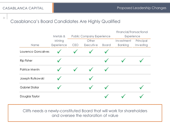 Proposed Leadership Changes 32 Conclusion • As a significant shareholder, Casablanca is troubled by the value destruction that has occurred under this Board's watch • Cliffs desperately needs a new strategy and leadership with a fresh perspective — the status quo is unacceptable in our view and shareholders have suffered enough • We believe substantial shareholder representation among a group of highly qualified, independent directors on Cliffs’ Board, and a new CEO, are critical components of any solution Casablanca believes its slate of director nominees is overwhelmingly qualified and offers a superior alternative to the incumbent directors who are expected to be up for reelection at the 2014 annual meeting