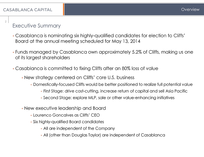 Disclaimer 1 This presentation with respect to Cliffs Natural Resources, Inc. ("Cliffs" or the "Company") is for general informational pur pos es only. It does not have regard to the specific investment objective, financial situation, suitability or particular need of any specific person who may receive thi s p resentation, and should not be taken as advice on the merits of any investment decision. The views expressed herein represent the opinions of Casablanca Capital LP ( "Ca sablanca"), and are based on publicly available information and Casablanca analyses. Certain financial information and data used herein have been derived or obtained from filings made with the SEC by the Company or other companies considered comparable, and from other third party reports. Casablanca has not sough t o r obtained consent from any third party to use any statements or information indicated herein. Any such statements or information should not be viewed as in dicating the support of such third party for the views expressed herein. No representation or warranty is made that data or information, whether derived or obta ine d from filings made with the SEC or from any third party, are accurate. There is no assurance or guarantee with respect to the prices at which any securities of the Company will trade, and such sec uri ties may not trade at prices that may be implied herein. The estimates, projections, pro forma information and potential impact of Casablanca's action plan set for th herein are based on assumptions that Casablanca believes to be reasonable, but there can be no assurance or guarantee that actual results or performance of the Co mpa ny will not differ, and such differences may be material. This presentation does not recommend the purchase or sale of any security. Casablanca reserves t he right to change any of its opinions expressed herein at any time as it deems appropriate. Casablanca disclaims any obligation to update the information contained he rein. Under no circumstances is this presentation to be used or considered as an offer to sell or a solicitation of an offer to buy an y security. Private investment funds advised by Casablanca currently hold shares of the Company's common stock. Casablanca manages investment funds that are in th e b usiness of trading – buying and selling – public securities. It is possible that there will be developments in the future that cause Casablanca and/or one o r more of the investment funds it manages, from time to time (in open market or privately negotiated transactions or otherwise), to sell all or a portion of th eir shares (including via short sales), buy additional shares or trade in options, puts, calls or other derivative instruments relating to such shares. Casablanca and su ch investment funds also reserve the right to take any actions with respect to their investments in the Company as they may deem appropriate. CASABLANCA CAPITAL LP, DONALD G. DRAPKIN AND DOUGLAS TAYLOR (COLLECTIVELY, “CASABLANCA") INTEND TO FILE WITH THE SECURITIES A ND EXCHANGE COMMISSION (THE “SEC”) A DEFINITIVE PROXY STATEMENT AND ACCOMPANYING FORM OF PROXY CARD TO BE USED IN CONNECTION WITH THE SOL ICI TATION OF PROXIES FROM STOCKHOLDERS OF CLIFFS NATURAL RESOURCES INC. (THE "COMPANY") IN CONNECTION WITH THE COMPANY'S 2014 ANNUAL MEETI NG OF STOCKHOLDERS. ALL STOCKHOLDERS OF THE COMPANY ARE ADVISED TO READ THE DEFINITIVE PROXY STATEMENT AND OTHER DOCUMENTS RELATED TO THE SOLICITATION OF PROXIES BY CASABLANCA, ROBERT P. FISHER, JR., CELSO LOURENCO GONCALVES, PATRICE E. MERRIN, JOSEPH RUTKOWSKI A ND GABRIEL STOLIAR (COLLECTIVELY, THE "PARTICIPANTS"), WHEN THEY BECOME AVAILABLE, BECAUSE THEY WILL CONTAIN IMPORTANT INFORMATION, INCLUDING AD DIT IONAL INFORMATION RELATED TO THE PARTICIPANTS. WHEN COMPLETED, THE DEFINITIVE PROXY STATEMENT AND AN ACCOMPANYING PROXY CARD WILL BE FURNISHED TO SOME OR ALL OF THE COMPANY'S STOCKHOLDERS AND ARE, ALONG WITH OTHER RELEVANT DOCUMENTS, AVAILABLE AT NO CHARGE ON THE SEC'S WEB SITE AT HTTP :// WWW.SEC.GOV. IN ADDITION, OKAPI PARTNERS LLC, CASABLANCA'S PROXY SOLICITOR, WILL PROVIDE COPIES OF THE DEFINITIVE PROXY STATEMENT AND ACCO MPA NYING PROXY CARD WITHOUT CHARGE UPON REQUEST BY CALLING (212) 297 - 0720 OR TOLL - FREE AT (877) 274 - 8654 . INFORMATION ABOUT THE PARTICIPANTS AND A DESCRIPTION OF THEIR DIRECT OR INDIRECT INTERESTS BY SECURITY HOLDINGS ARE CONTAINED IN THE PRELIMINARY PROXY STATEMENT ON SCHEDULE 14A FILED BY CASABLANCA WITH THE SEC ON MARCH 6, 2014. THIS DOCUMENT CAN BE OBTAINED FREE OF CHAR GE FROM THE SOURCES INDICATED ABOVE.