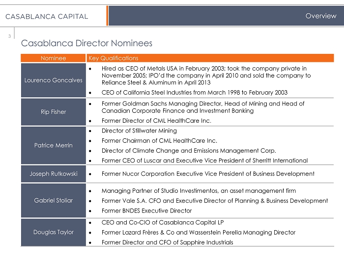 Overview 2 Executive Summary • Casablanca is nominating six highly - qualified candidates for election to Cliffs’ Board at the annual meeting scheduled for May 13, 2014 • Funds managed by Casablanca own approximately 5.2% of Cliffs , making us one of its largest shareholders • Casablanca is committed to fixing Cliffs after an 80% loss of value • New strategy centered on Cliffs’ core U.S. business • Domestically - focused Cliffs would be better positioned to realize full potential value • First Stage: drive cost - cutting, increase return of capital and sell Asia Pacific • Second Stage: explore MLP, sale or other value - enhancing initiatives • New executive leadership and Board • Lourenco Goncalves as Cliffs’ CEO • Six highly - qualified Board candidates • All are independent of the Company • All (other than Douglas Taylor) are independent of Casablanca