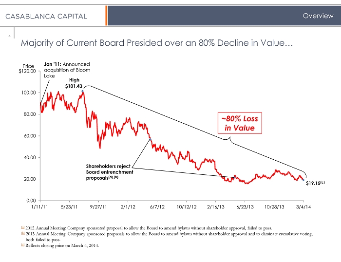 Overview 3 Casablanca Director Nominees Nominee Key Qualifications Lourenco Goncalves Hired as CEO of Metals USA in February 2003; took the company private in November 2005; IPO’d the company in April 2010 and sold the company to Reliance Steel & Aluminum in April 2013 CEO of California Steel Industries from March 1998 to February 2003 Rip Fisher Former Goldman Sachs Managing Director, Head of Mining and Head of Canadian Corporate Finance and Investment Banking Former Director of CML HealthCare Inc. Patrice Merrin Director of Stillwater Mining Former Chairman of CML HealthCare Inc. Director of Climate Change and Emissions Management Corp. Former CEO of Luscar and Executive Vice President of Sherritt International Joseph Rutkowski Former Nucor Corporation Executive Vice President of Business Development Gabriel Stoliar Managing Partner of Studio Investimentos, an asset management firm Former Vale S.A. CFO and Executive Director of Planning & Business Development Former BNDES Executive Director Douglas Taylor CEO and Co - CIO of Casablanca Capital LP Former Lazard Frères & Co and Wasserstein Perella Managing Director Former Director and CFO of Sapphire Industrials