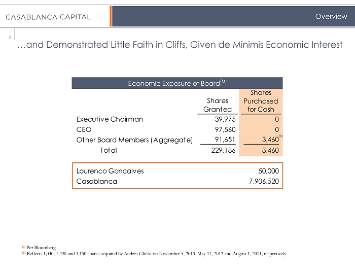 Overview 4 Majority of Current Board Presided over an 80% Decline in Value… [ a] 2012 Annual Meeting: Company sponsored proposal to allow the Board to amend bylaws without shareholder approval, failed to pass. [ b] 2013 Annual Meeting: Company sponsored proposals to allow the Board to amend bylaws without shareholder approval and to eliminate cumulative voting, both failed to pass. [c ] Reflects closing price on March 4, 2014. Price $101.43 0.00 20.00 40.00 60.00 80.00 100.00 $120.00 1/16/11 5/23/11 9/27/11 2/1/12 6/7/12 10/12/12 2/16/13 6/23/13 10/28/13 3/4/14 $19.15 (c) Jan '11: Announced acquisition of Bloom Lake Shareholders reject Board entrenchment proposals (a), (b) High 1/11/11 ~80 % Loss in Value