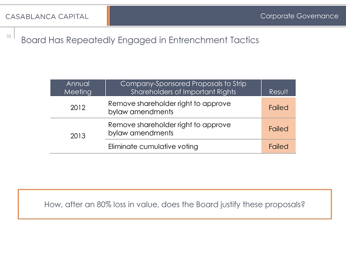 Sitting Directors Est. Aggregate Responsible for Approving: Amount Invested Further Project ($ millions) Project Status Acquisition Investment Chromite (a) $500 Suspended in 2Q 2013 5 / 6 8 Coal (b) 1,230 Expected breakeven in 2014 6 10 Amapá (c) 500 Divested for “nominal” amount in 3Q 2013 3 8 Wabush (d) 285 Idled 1Q 2014 5 10 Subtotal: $2,515 Plus: Bloom Lake 6,400 Total $8,915 Corporate Governance 9 Bloom Lake Is Part of a ~$9 billion Value - Destroying Diversification Strategy [ a] Five of the current directors were on the Board at the time of the $154 million Chromite Ontario transaction (11/23/09) and 6 w ere on the Board at the time of the $ 78 million Chromite Far North transaction (5/25/10). $500 million estimated total investment includes ~$70 million per year for feasibility and assessment studies, over 3 years. [ b] Based on $757 million acquisition of West Virginia Coal (7/6/10) plus ~$470 million cumulative capex between 2010 and 2013. Ex cludes impact of Sonoma Coal (acquired for $140 million (1/9/07), divested for $141 million (7/10/12)). 2014 breakeven assumption based on midpoint of Co mpa ny guidance of $85 – $90 expected revenues/ton and $85 – $90 expected cash costs/ton. [ c] Based on $ 498.6 million book value and accounted for under the equity method as of 12/31/11. [d ] Based on $103 million purchase price (initial stake acquired (1/1/97) for $15 million and remaining interest acquired (10/9/0 9) for $88 million), plus Casablanca - estimated $80 million cumulative capex, plus Company - announced $100 million idling costs . Cumulative capex estimated based on difference between $183 million asset impairment charge incurred in Q4 2013 and $103 million cumulative purchase price . Most of the current Board oversaw these investments We believe these transactions demonstrate a consistent pattern of poor Board oversight and judgment