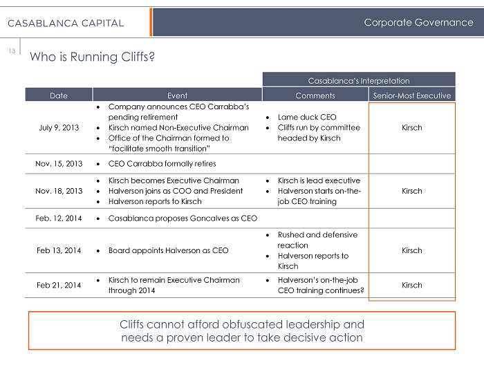 Corporate Governance 12 Hurried and Defensive CEO Appointment The rushed manner in which Mr. Halverson was appointed to the CEO position represents a poor exercise of the Board’s fiduciary duties [ a] Announced October 25, 2013. Mr. Halverson assumed the President and COO position effective November 18, 2013. One day later, Board deems Halverson ready to become CEO Casablanca’s Interpretation: Halverson needed on - the - job training before assuming the CEO spot February January December November November 18 Halverson appointed President and COO “to build a deep understanding of the business at an operating level before assuming the CEO leadership position” (a) January 27 Casablanca Letter detailing proposals to enhance value February 12 Casablanca proposes Lourenco Goncalves as CEO of Cliffs February 13 One day later, Cliffs announces Halverson as CEO