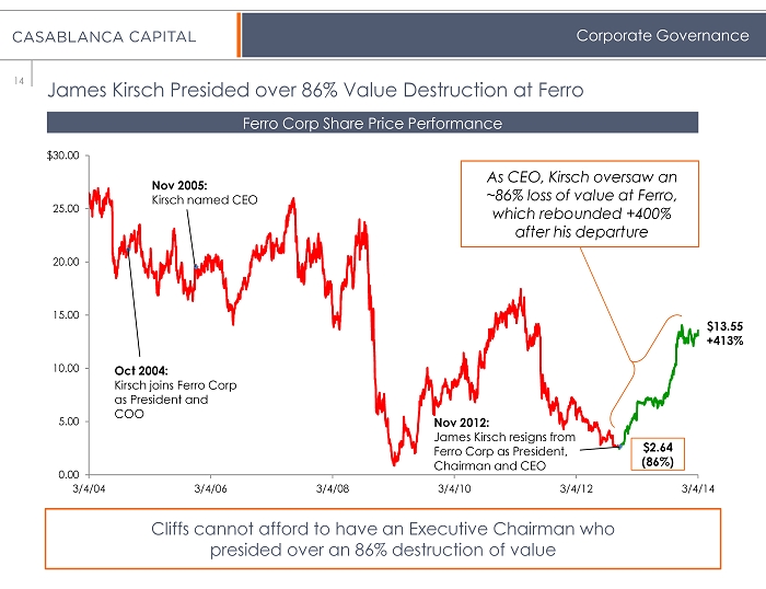Corporate Governance 13 Who is Running Cliffs ? Cliffs cannot afford obfuscated leadership and needs a proven leader to take decisive action Casablanca’s Interpretation Date Event Comments Senior - Most Executive July 9, 2013 Company announces CEO Carrabba’s pending retirement Kirsch named Non - Executive Chairman Office of the Chairman formed to “facilitate smooth transition” Lame duck CEO Cliffs run by committee headed by Kirsch Kirsch Nov. 15, 2013 CEO Carrabba formally retires Nov. 18, 2013 Kirsch becomes Executive Chairman Halverson joins as COO and President Halverson reports to Kirsch Kirsch is lead executive Halverson starts on - the - job CEO training Kirsch Feb. 12, 2014 Casablanca proposes Goncalves as CEO Feb 13, 2014 Board appoints Halverson as CEO Rushed and defensive reaction Halverson reports to Kirsch Kirsch Feb 21, 2014 Kirsch to remain Executive Chairman through 2014 Halverson’s on - the - job CEO training continues? Kirsch