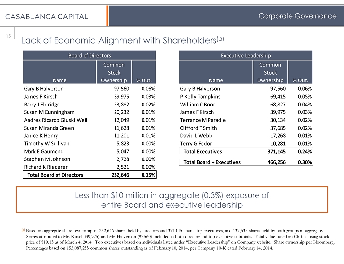 0.00 5.00 10.00 15.00 20.00 25.00 $30.00 3/4/04 3/4/06 3/4/08 3/4/10 3/4/12 3/4/14 Corporate Governance 14 James Kirsch Presided over 86% Value Destruction at Ferro [ ] of 11 approved subsequent investment in Bloom Lake (additional ~$1.5 billion) $ 13.55 +413% Oct 2004: Kirsch joins Ferro Corp as President and COO Nov 2012: James Kirsch resigns from Ferro Corp as President, Chairman and CEO $2.64 (86%) Cliffs cannot afford to have an Executive Chairman who presided over an 86% destruction of value As CEO, Kirsch oversaw an ~86% loss of value at Ferro, which rebounded +400% after his departure Ferro Corp Share Price Performance Nov 2005: Kirsch named CEO