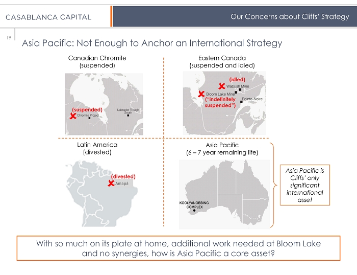 Our Concerns about Cliffs’ Strategy 18 Kick the Can(ada) • Idling the Bloom Lake expansion should have happened a long time ago and is not a new strategy, in our view Company “Strategy” Casablanca’s Concerns Preferred Bloom Lake JV or sale Difficult to execute in a reasonable time frame and on reasonable terms Backup Shut down all of Bloom Lake Permanently extinguish es hope of recouping the ~$6.5 billion (and growing) cost of Bloom Lake How can idling Bloom Lake be credibly held out as evidence of a new strategic direction? Grim array of potential outcomes