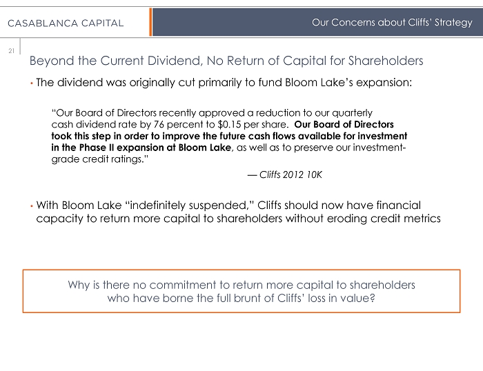 $497 $1,059 $699 $790 0 200 400 600 800 1,000 $1,200 2014 2015 2016 2017 2018 2019 2020 2021 2040 Our Concerns about Cliffs’ Strategy 20 “Reducing Net Debt” or Just Hoarding Cash? Is the Board truly committed to capital reallocation when cash balances can be redeployed at any moment towards the next “ opportunity ”? Company Guidance 2013A 2014E Cash $336 $671 (b) Debt $3,044 $3,044 [ a] Debt maturities exclude $1.75 billion undrawn revolving credit facility, which matures 2017, and recently - announced equipment fi nancing of $103 million, which Casablanca assumes will amortize over the life of the financing. [ b ] Reflects Company guidance of “double” the current cash balance as of Q4 2013. Guidance provided on earnings conference call on February 14, 2014. With no debt maturities before 2018, what does Cliffs intend to do with its cash? Debt Maturities (a)