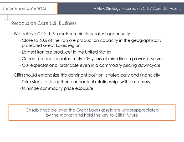 A New Strategy Focused on Cliffs’ Core U.S. Assets 23 Casablanca Plan : Install new l eadership : Board and CEO Refocus on core U.S. business Sell Asia Pacific Address cost structure Return capital to shareholders Explore second - stage value creation — by MLP, sale or otherwise