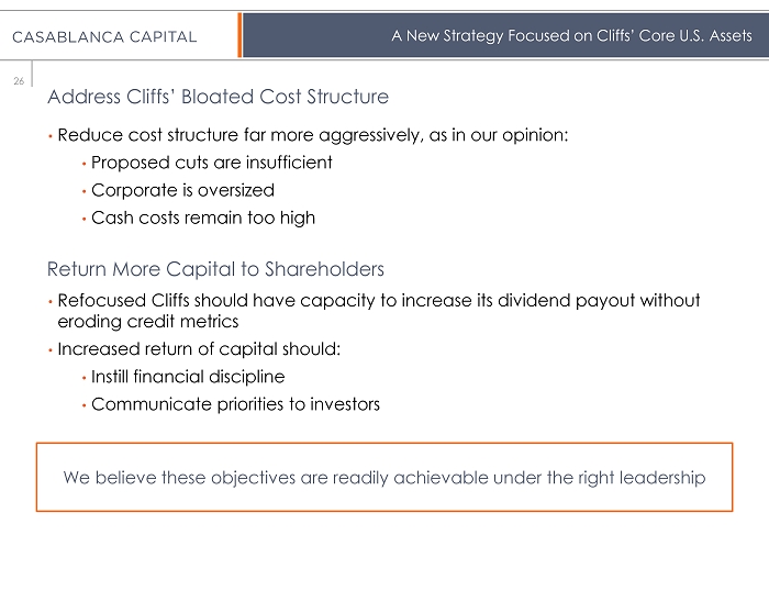A New Strategy Focused on Cliffs’ Core U.S. Assets 25 Extract Value through Immediate Divestiture of Asia Pacific • Unsolicited expressions of interest in Asia Pacific • A sale of Asia Pacific can capture an attractive valuation, in our opinion • Alternative to our prior spin - off proposal and dovetails with Cliffs’ announcement to suspend Bloom Lake • Proceeds from divestiture could be used to: • Finance obligations at Bloom Lake • Reduce debt • Return capital to shareholders • Given the limited remaining life of these assets, we believe the Company must act now to maximize this value While we previously proposed a spin - off of the international assets as our preferred mechanism, a separation between Cliffs’ core business and the international businesses, by any mechanism , was and continues to be our ultimate objective