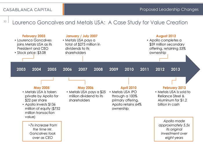 29 • Metals USA • Served as President and Chief Executive Officer from February 2003 until the sale of Metals USA to Reliance Steel & Aluminum in April 2013 • Metals USA was one of the largest metals service center businesses in the United States, operating 48 locations • California Steel Industries (CSI) • Served as President and Chief Executive Officer of CSI, a joint venture between Vale and Kawasaki Steel (now JFE Holdings), from March 1998 to February 2003 • Transformed company from a break - even steel producer into one of the most important and profitable players in the flat rolled steel industry • Companhia Siderurgica Nacional (CSN) • From 1981 to 1998 Mr. Goncalves worked at CSN, where he held the position of Managing Director • CSN is one of the largest steel producers in Brazil and is vertically integrated with iron ore operations Proposed Leadership Changes Lourenco Goncalves Brings over 30 Years of Experience in Metals & Mining Lourenco Goncalves is a proven value creator for shareholders